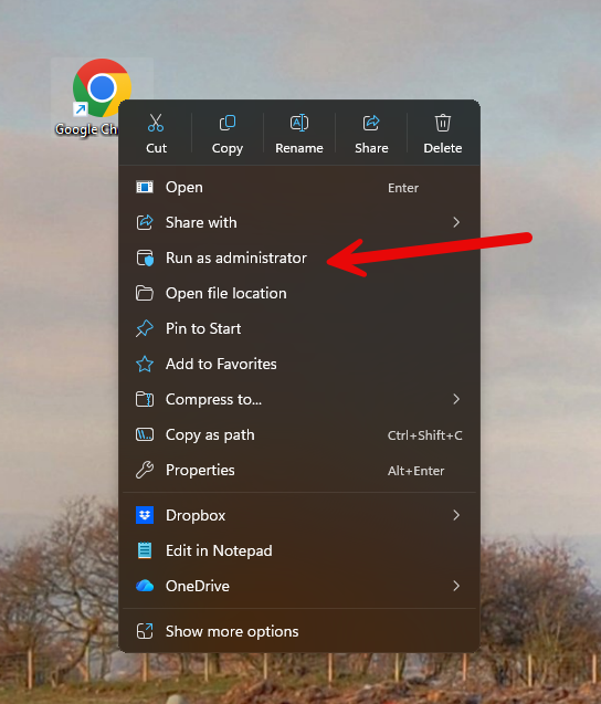 The simplest method. First, right-click the application (.exe or shortcut), then select Run as administrator.